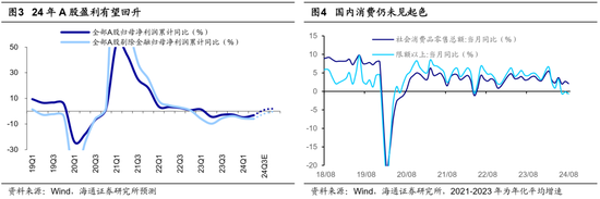 地产、消费领域是近期政策发力的重点。地产方面,目前地产供需两端均在调整中,8月地产销售面积累计同比增速为-18%,地产投资累计同比增速为-10.2%。9/24国新办新闻发布会上央行表示,将降低存量房贷利率,并统一房贷的最低首付比例。926政治局会议要求促进房地产市场“止跌回稳”,提出对商品房建设要严控增量、优化存量、提高质量,并调整住房限购政策等。我们认为后续地产收储或加大力度,包括大城市在内的限购政策也可能调整,这有望推动地产基本面逐渐企稳。