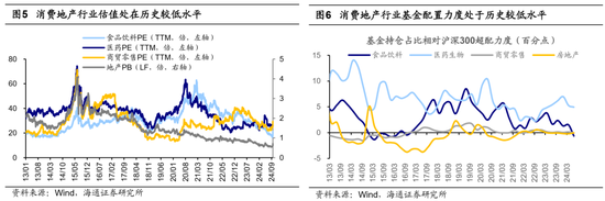 当前地产、消费、医药行业估值和基金配置力度处于历史低位。估值方面,截至24/09/27,医药PE(TTM,下同)为29.2倍(处13年以来由低到高23.2%分位,下同),食品饮料PE为21.2倍(17.6%),商贸零售PE为29.3倍(56.2%),房地产PB(LF)为0.71倍(6.8%)。基金配置方面,相关行业基金配置力度已处于历史低位,24Q2基金重仓股中医药持仓占比相对沪深300超配比例为5.0个百分点、处13年以来15.5%分位,食品饮料超配比例为-0.6个百分点、处24.4%分位,商贸零售超配比例为-0.2个百分点、处51.1%分位,地产超配比例为0个百分点、处51.1%分位。