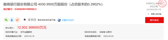 其中,中粮集团挂牌转让徽商银行3810.75万股股份,占总股本的0.27%,底价1.18亿元;中粮科技转让徽商银行4030.95万股股份,占总股本的0.29%,底价1.25亿元。
